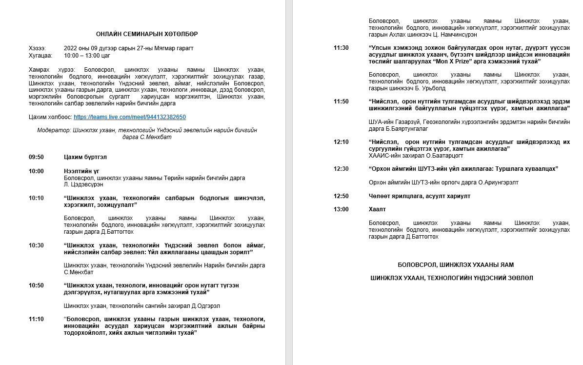 2022 оны 09 дүгээр сарын 27-ны өдөр Шинжлэх ухаан, технологийн Үндэсний зөвлөл санаачлан Боловсрол, шинжлэх ухааны яам, ШУТСантай хамтран 21 аймаг, нийслэлийн Боловсрол, шинжлэх ухааны газрын дарга, шинжлэх ухаан, технологи, инноваци, дээд боловсрол, мэргэжлийн боловсрол, сургалт хариуцсан мэргэжилтэн, Шинжлэх ухаан, технологийн салбар зөвлөлийн нарийн бичгийн дарга, гишүүдэд зориулсан цахим семинарыг амжилттай зохион байгууллаа.